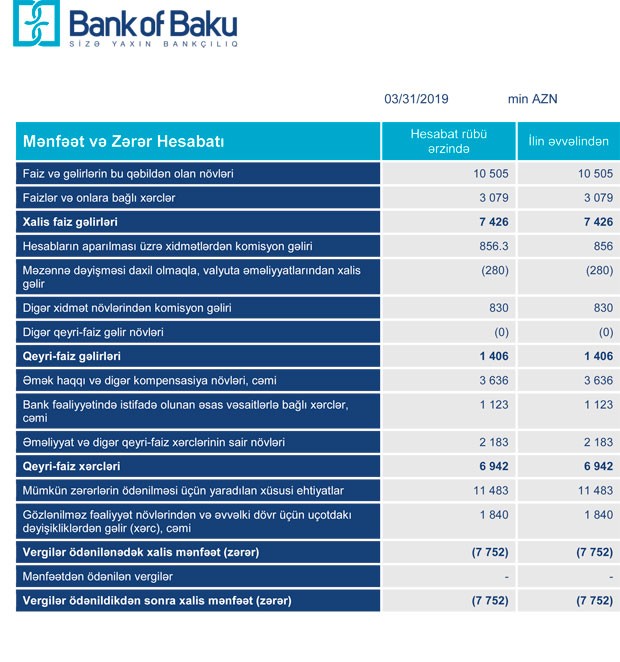 “Bank of Baku” ASC 2019-cu ilin 1-ci rübü üzrə maliyyə göstəricilərini açıqlayıb.