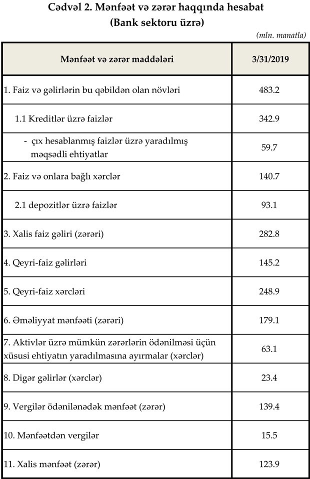 Müqayisə üçün qeyd edək ki, 2018-ci ilin 1-ci rübündə bankların cəmi gəlirləri (faiz və qeyri-faiz gəlirləri) 542,5 milyon manat, cəmi xərcləri (faiz və qeyri-faiz xərcləri) isə 394,6 milyon manat təşkil etmişdi. Gəlirlər xərcləri üstələdiyindən 147.9 milyon manat əməliyyat mənfəti formalaşmışdı. Banklar aktivlər üzrə mümkün zərərlərin ödənilməsi üçün xüsusi ehtiyatın yaradılmasına 197.5 milyon manat ayırdığından 55.9 milyon manat zərər yaranmışdı.
