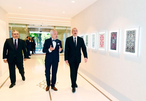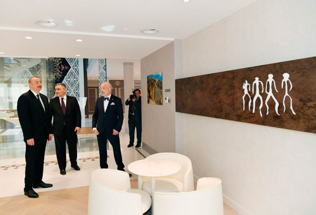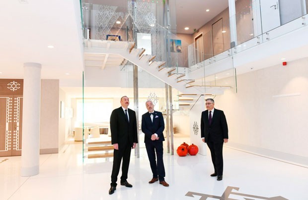 Azərbaycan Prezidenti binanın rəmzi açılışını bildirən lenti kəsib.