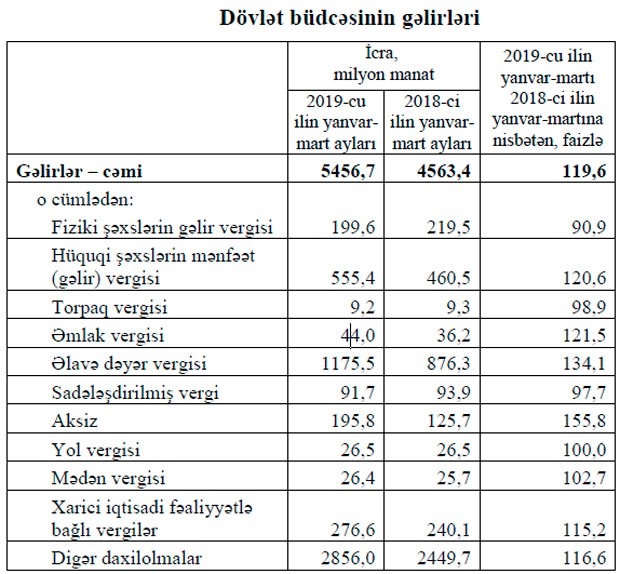 Daxilolma hüquqi şəxslərin mənfəət vergisi üzrə 20,6% artaraq 555,4 milyon manat, əmlak vergisi üzrə 21,5% artaraq 44 milyon manat, əlavə dəyər vergisi üzrə 34,1% artaraq 1 milyard 175,5 milyon manat, aksiz üzrə 55,8% artaraq 195,8 milyon manat, mədən vergisi üzrə 2,7% artaraq 26,4 milyon manat, xarici iqtisadi fəaliyyətlə bağlı vergilər üzrə 15,2% artaraq 276,6 milyon manat təşkil edib. Yol vergisi üzrə daxilolma dəyişməyərək 26,5 milyon manatda qalıb.