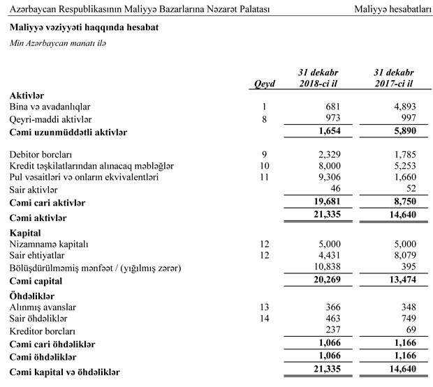 2018-ci il ərzində Maliyyə Bazarlarına Nəzarət Palatasının cəmi aktivləri 46% artaraq 21 milyon 335 min manata çatıb. 2017-ci ilin sonunda Palata 14 milyon 640 min manat cəmi aktivlərə malik idi.