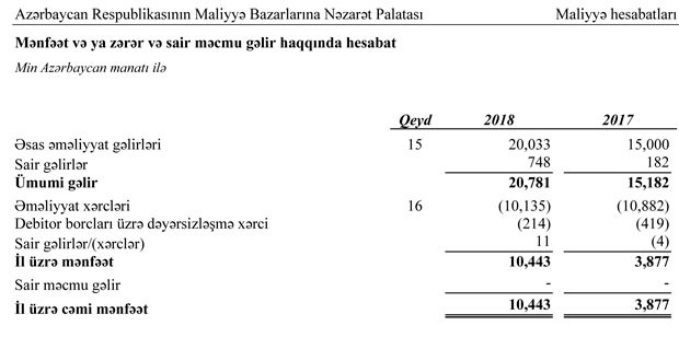 Maliyyə Bazarlarına Nəzarət Palatası 2018-ci ili 10 milyon 443 min manat xalis mənfəət ilə başa vurub. Bu, 2017-ci illə müqayisədə 2,7 dəfə çoxdur. Palata 2017-ci ili 3 milyon 877 min manat xalis mənfəət ilə bağlamışdı.