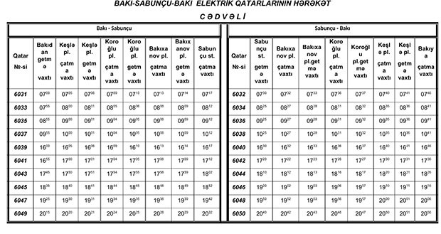 "İyun ayının 3-dən etibarən Bakı-Sabunçu-Bakı elektrik qatarları yeni hərəkət cədvəli üzrə hərəkət edəcək. Qatarlarda gediş plastik kartla və biletlə təşkil olunacaq. Yeni hərəkət cədvəli haqqında əlavə məlumat veriləcək.