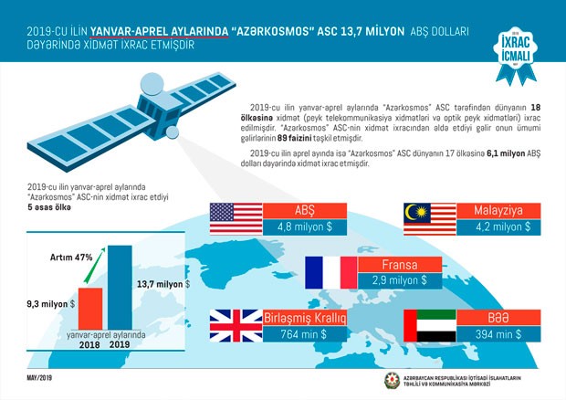 2019-cu ilin aprel ayında isə “Azərkosmos” ASC dünyanın 17 ölkəsinə 6 milyon ABŞ dolları dəyərində xidmət ixrac edib. “Azərkosmos” ASC-nin 2019-cu ilin yanvar-aprel aylarında xidmət ixracı həyata keçirdiyi əsas ölkələr ABŞ, Malayziya, Fransa, Birləşmiş Krallıq, BƏƏ-dir.