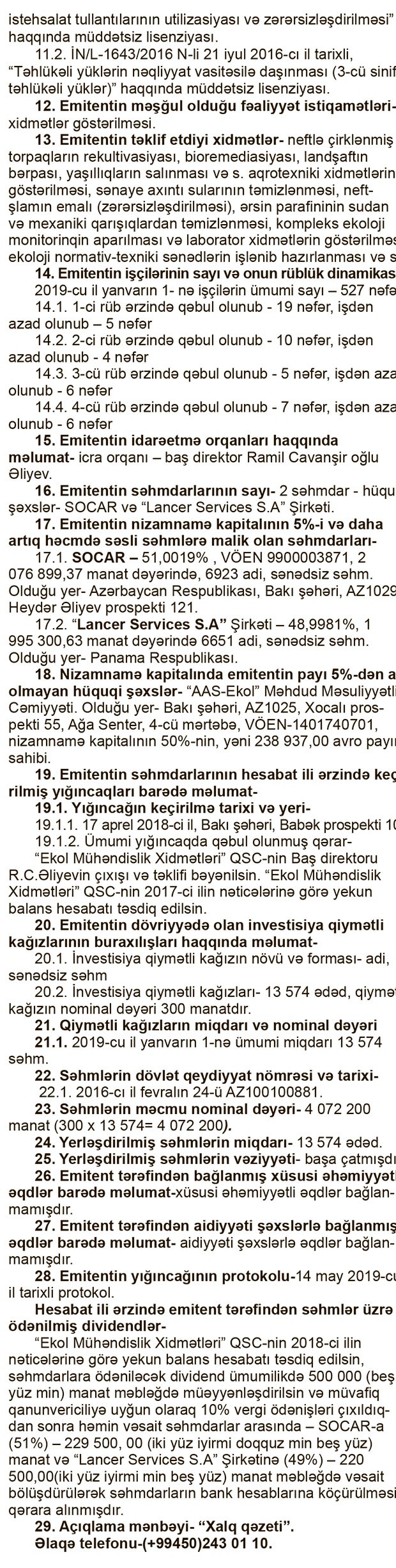 Ötən il “Ekol Mühəndis Xidmətləri” “birgə müəssisənin maliyyə nəticələrində pay” maddəsi üzrə 1 milyon 408 min manat gəlir əldə edilib. Nəticədə 2 milyon 287 min manat vergidən əvvəlki mənfəət formalaşıb. 276 min manat mənfəət vergisi ödənildikdən sonra 2 milyon 11 min manat xalis mənfəəti qalıb.