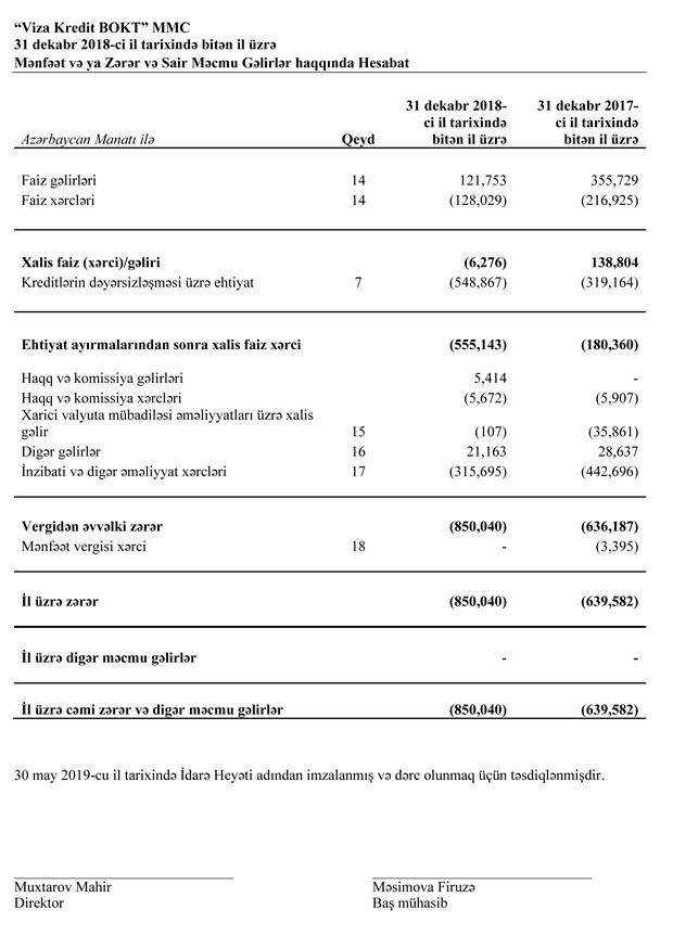 “Viza Kredit BOKT” MMC 2018-ci ili 850 min manat xalis zərər ilə başa vurub. Müqayisə üçün qeyd edək ki, təşkilat 2017-ci ili 640 min manat zərər ilə bağlamışdı. Beləliklə, illik müqayisədə “Viza Kredit”in xalis zərəri 210 min manat və ya 32,8% artıb.