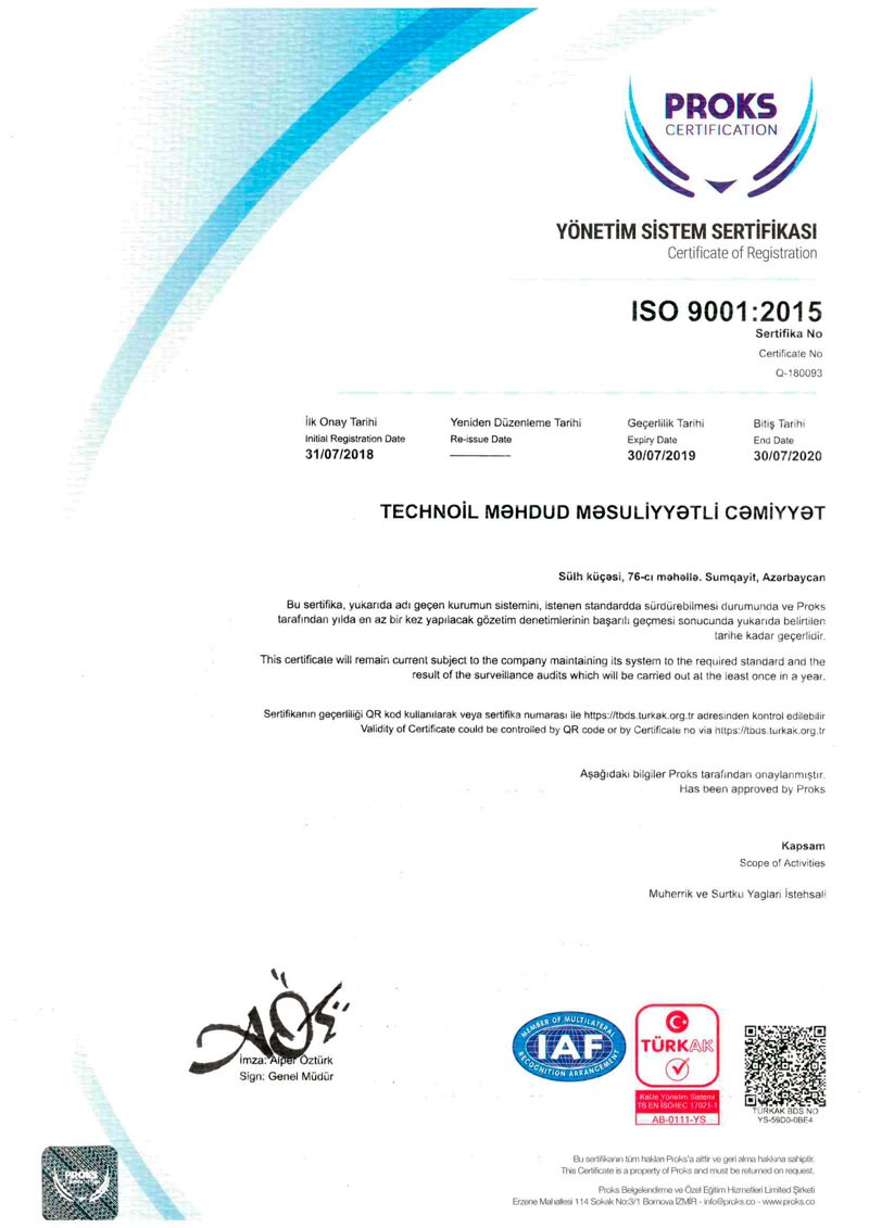 “TECHNOL”, mühərrik yağları istehsalı sahəsində bu sertifikatı alan ilk şirkətdir. Korporasiya həmçinin İSO 9001:2015 İdarəetmə sertifikatına da sahibdir.