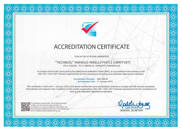 Azərbaycanın ilk muasir sürtgü və sənaye yağları istehsalçısı olan “TECHNOL” National Accreadation Centre (NAC) tərəfindən aparılan audit yoxlamaları nəticəsində şirkətin laboratoriya cihazlarının test və kallibarsiya standartlarının İSO 17025:2017 standartlarına tam uyğunluğunu təsdiq edən akkreditasiya sertifikatını əldə etmişdir. Bu sertifikat, laboratoriya tərəfindən edilən testlərin və keyfiyyət göstəricilərinin dəqiqişləməsini və kompleks yoxlamaların aparılma imkanlarını təsdiq edir.