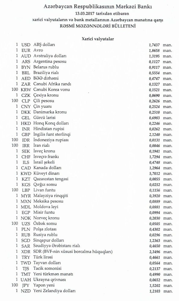 Martın 13-nə Mərkəzi Bankın açıqladığı rəsmi Dollar/manat məzənnəsi Martın 10-u ilə müqayisədə dəyişməyərək 1,7437 manat olub, Avro/manat məzənnəsi isə 1.8658 manata qalxıb.