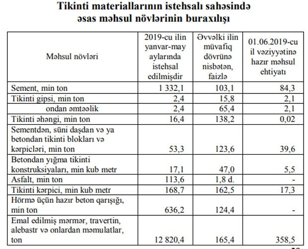 "Marja" Dövlət Statistika Komitəsinin aylıq hesabatına istinadən xəbər verir ki, tikinti kərpicinin istehsalı 62,5 faiz, tikinti əhənginin istehsalı 38,2 faiz, hörmə üçün hazır beton qarışığının istehsalı 24,4 faiz, sementin istehsalı 3,1 faiz artmış, betondan yığma tikinti konstruksiyalarının istehsalı 53,0 faiz, tikinti gipsinin istehsalı 84,2 faiz azalmışdır.