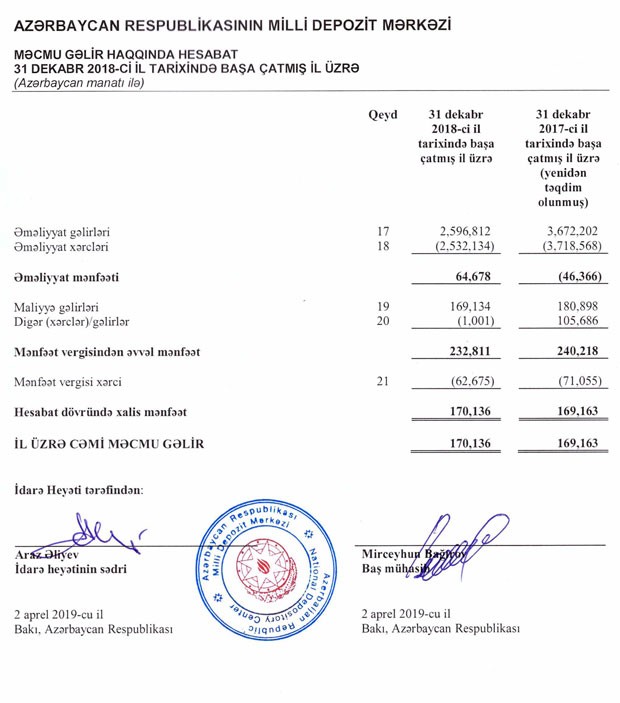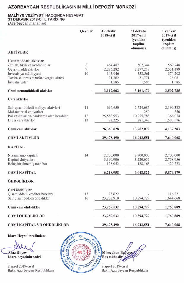 Azərbaycanın mərkəzi depozitarı olaraq Azərbaycan Respublikasının Maliyyə Bazarlarına Nəzarət Palatası tərəfindən təsis edilmiş qeyri-kommersiya hüquqi şəxs Milli Depozit Mərkəzi (MDM) 2018-ci li 170 min manat xalis mənfəət ilə başa vurub. MDM 2017-ci ili 169 min manat xalis mənfəət ilə bağlamışdı.