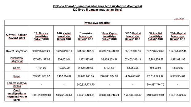 Bakı Fond Birjasında (BFB) ticarət olunan bazarlar üzrə birja üzvlərinin (investisiya şirkətlərinin) 2019-cu il yanvar-may ayları üzrə dövriyyələri açıqlanıb.