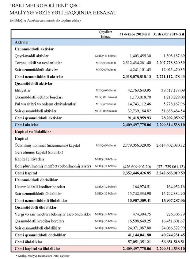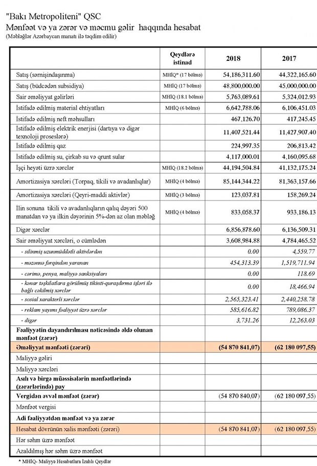 “Bakı Metropoliteni” QSC 2018-ci ili 54 milyon 871 min manat zərər ilə başa vurub. Bu, əvvəlki illə müqayisədə 11,75% azdır. Belə ki, QSC 2017-ci ili 62 milyon 180 min manat zərər ilə bağlamışdı.