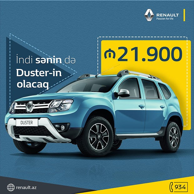 "Nurgün Motors" Renault modellərini 21.900 manatdan başlayan qiymətlərlə təklif edir. Məsələn, Renault Duster modelini 21.900 manatа əldə edə bilərsiniz.