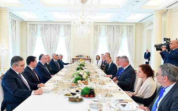 Təkbətək görüş başa çatdıqdan sonra Azərbaycan Prezidenti İlham Əliyevin Avropa İttifaqı Şurasının Prezidenti Donald Tuskla işçi nahar çərçivəsində geniş tərkibdə görüşü olub.