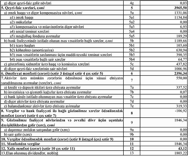 2019-cu ilin 1-ci yarısında 10 milyon 666 min manat cəmi gəlirlərə qarşı cəmi xərclər 8 milyon 819 min manat təşkil edib. Nəticədə 1 milyon 846 min manat mənfəət formalaşıb. Bank mənfəətdən 43 min manat mənfəət vergisi ödəyib.