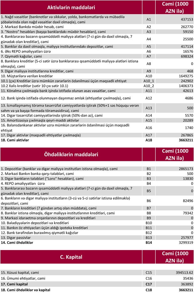 Bankın 1 iyul 2019-cu il tarixinə tutulmalardan sonra məcmu kapitalı 327,6 milyon manat, adi və imtiyazlı səhmlər isə 225,8 milyon manat təşkil edir.
