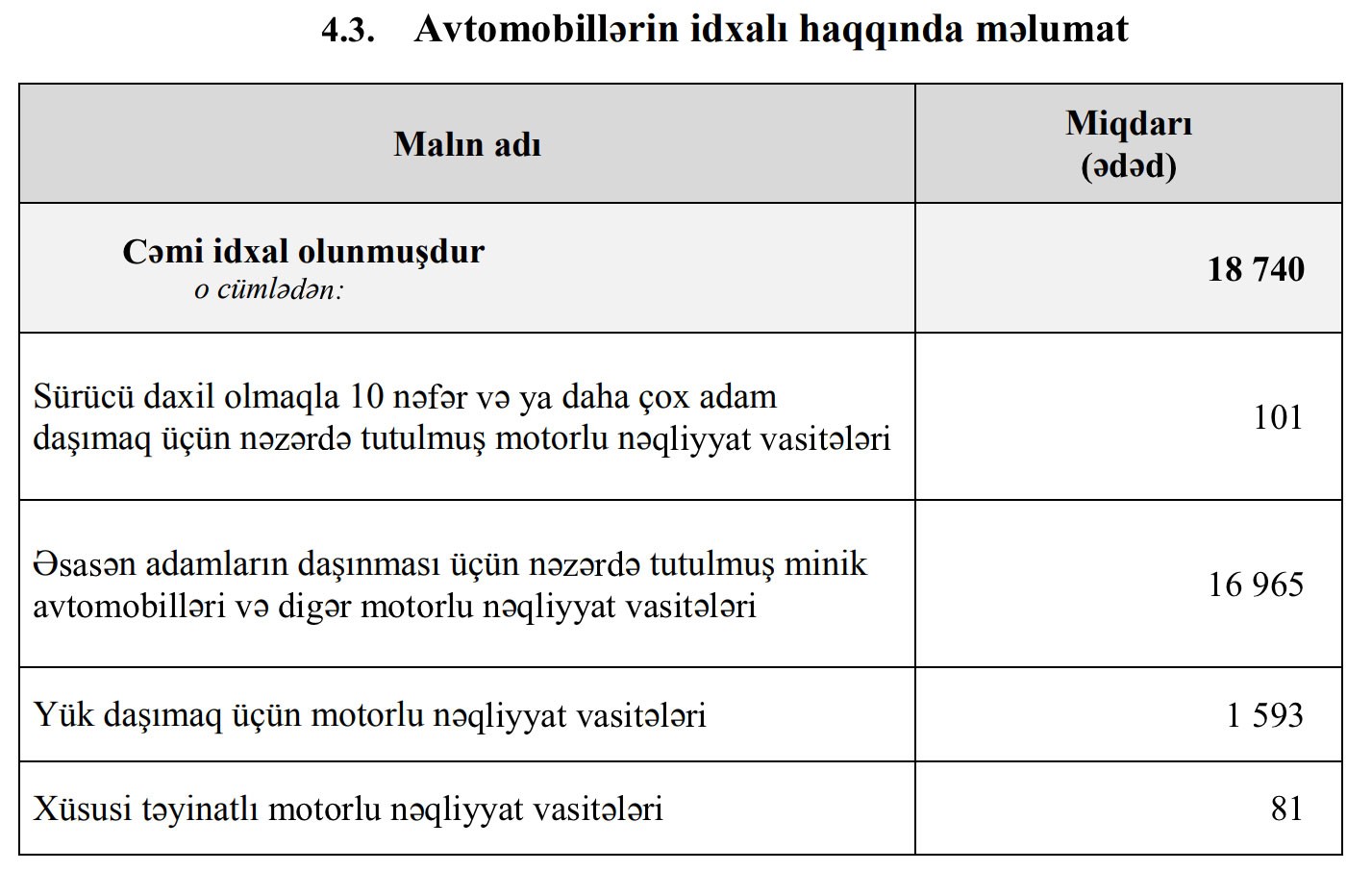 O cümlədən, 2019-cu ilin Yanvar-İyun aylarında 16 min 965 ədəd minik avtomobili, 101 ədəd avtobus, 1 593 ədəd yük avtomobili və 81 ədəd xüsusi təyinatlı vasitə idxal olunub.