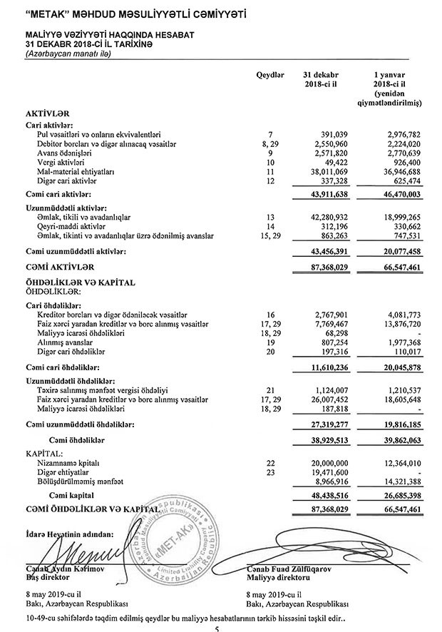 31 Dekabr 2018-ci il tarixində “METAK” 87 milyon 368 min manat cəmi aktivlərə, 38 milyon 929 min manat cəmi öhdəliklərə və 48 milyon 438 min manat cəmi kapitala malik olub. Müqayisə üçün qeyd edək ki, şirkət ötən ilin sonunda 66 milyon 547 min manat cəmi aktivlərə, 39 milyon 862 min manata cəmi öhdəliklərə və 26 milyon 685 min manat cəmi kapitala malik idi.