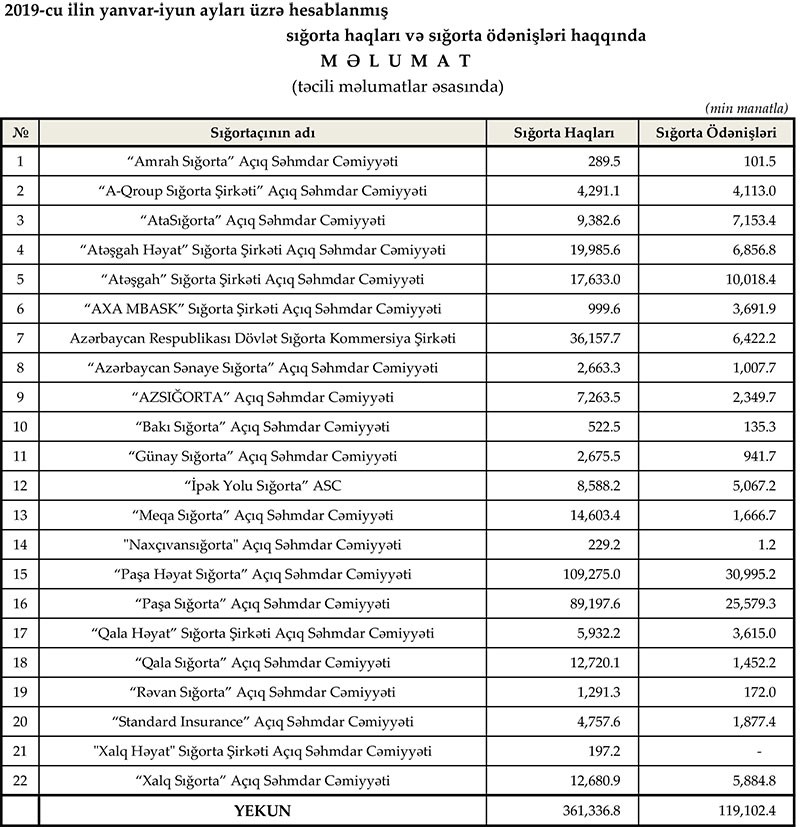 Müqayisə üçün qeyd edək ki, 2018-ci ilin yanvar-iyun ayları ərzində ölkədə fəaliyyət göstərən 21 sığorta şirkəti tərəfindən 396.37 mln. manat məbləğində sığorta haqları toplanmışdı. Beləliklə, toplanmış sığorta haqları 8,8% azalıb.