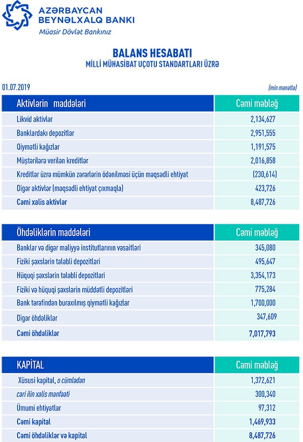 Azərbaycanın ən böyük bankı "Azərbaycan Beynəlxalq Bankı" ASC (ABB) 2019-cu ilin 1-ci yarısı üzrə maliyyə göstəricilərini açıqlayıb.