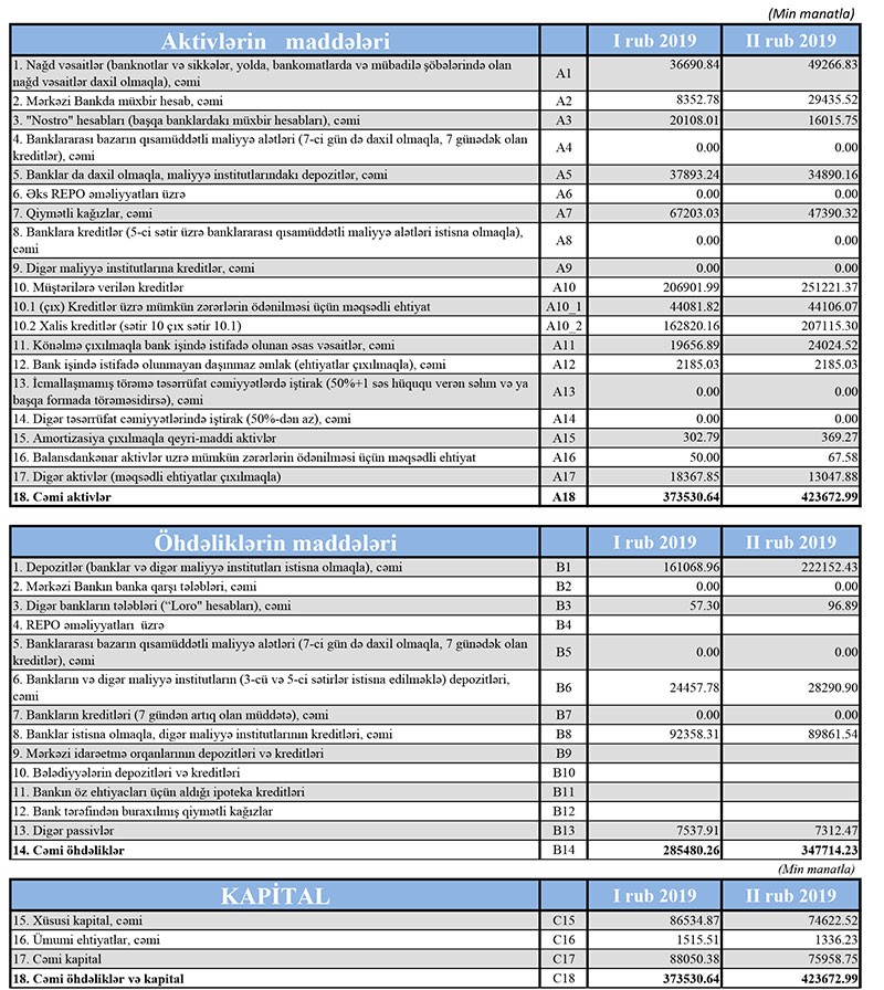 30 İyun 2019-cu il tarixində “AFB Bank” 423 milyon 672 min manat cəmi aktivlərə (o cümlədən 251 milyon 221.3 min manatı müştərilərə verilmiş kreditlər), 347 milyon 714 min manat cəmi öhdəliklərə və 75 milyon 959 min manat cəmi kapitala malik olub.