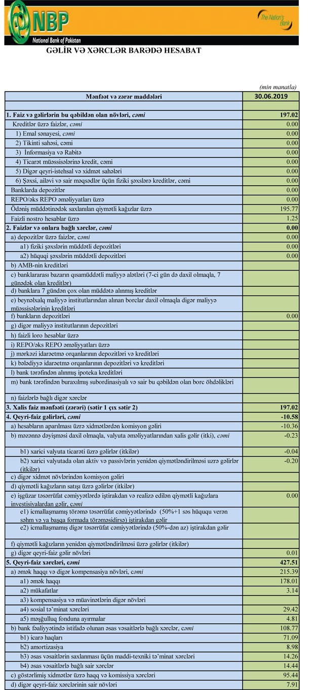 Müqayisə üçün qeyd edək ki, Pakistan Milli Bankının Bakı filialı ötən ilin 1-ci yarısını 31 min manat mənfəətlə başa vurmuşdu. 2018-in ilk 6 ay ərzində Pakistan bankının faiz gəlirləri 435 min manat, qeyri-faiz gəlirləri 1 min manat təşkil etmişdi.