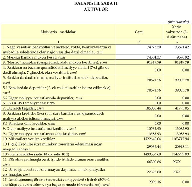 Qeyd edilib ki, Bankın aktivləri 2019-cu ilin altı ayı ərzində 6.33% artaraq 30 İyun 2019-cu il tarixində 2 milyard 135 milyon 270 min manat təşkil edib.