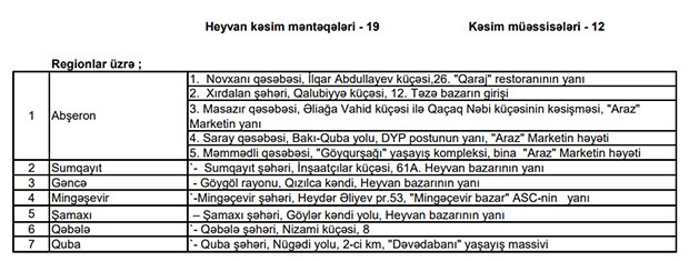 Qurban bayramı dövründə Bakı şəhərinin rayonları və regionlar üzrə heyvan kəsimi məntəqələrinin dislokasiya yerləri haqqında