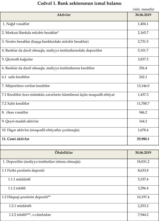 30 iyun 2019-cu il tarixinə Azərbaycanda fəaliyyət göstərən bankların cəmi aktivləri 29 milyard 980.1 milyon manat, cəmi öhdəlikləri isə 25 milyard 380.5 milyon manat təşkil edib. Sektorun balans kapitalı 4 milyard 599.6 milyon manat olub.