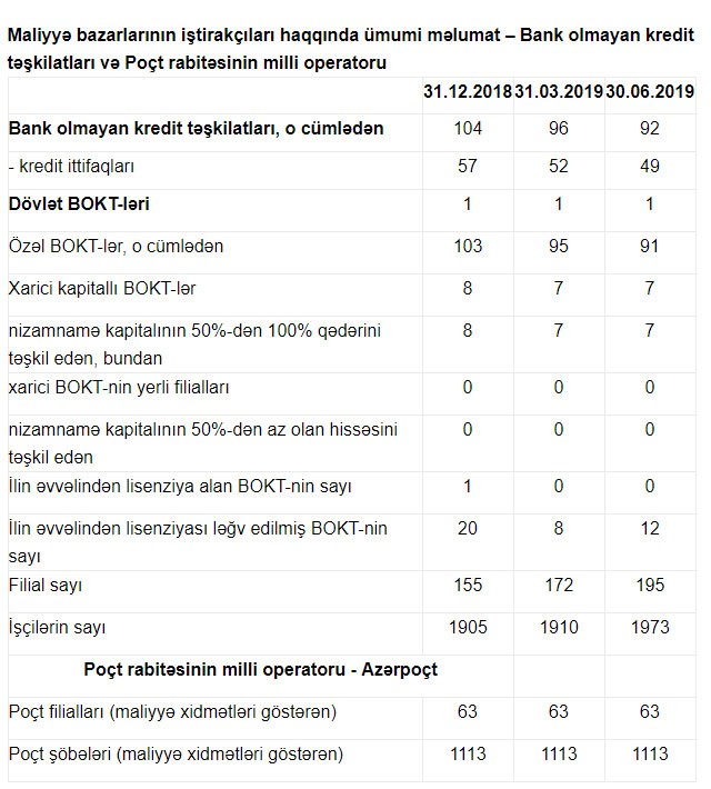 2019-cu ilin 2-ci rübündə Azərbaycanda bank olmayan kredit təşkilatlarının sayı 4 təşkilat azalıb.
