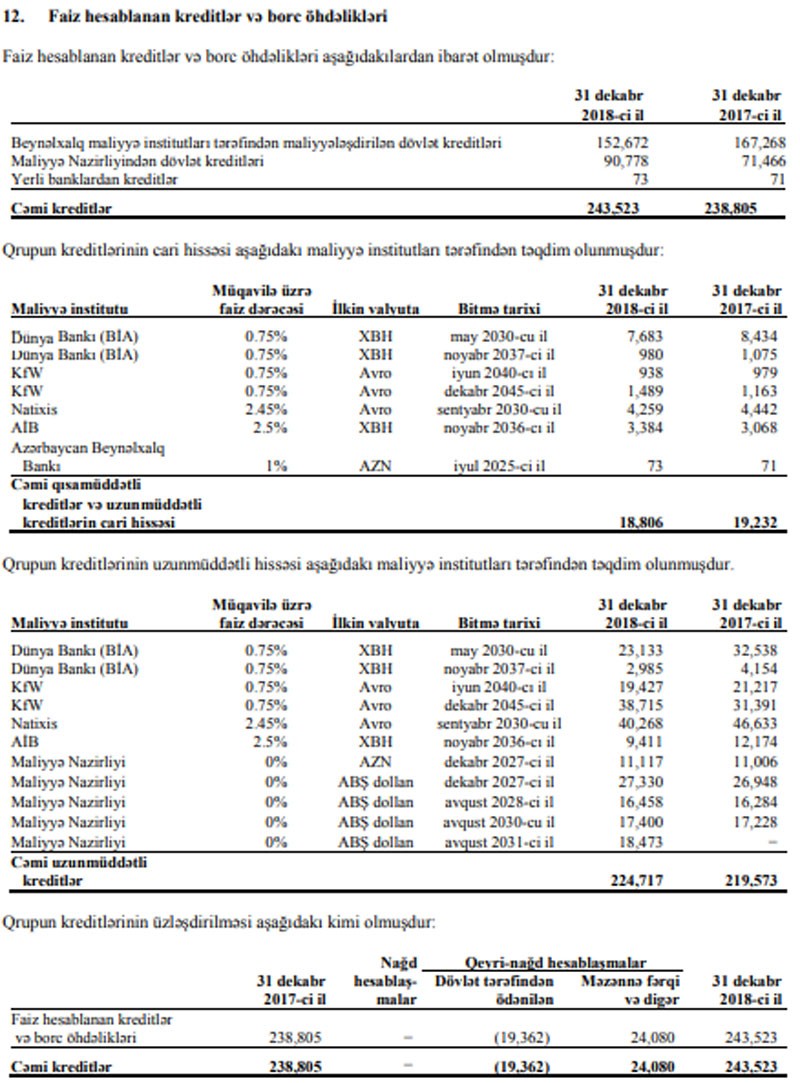 Ötən il Beynəlxalq maliyyə institutları tərəfindən maliyyələşdirilən dövlət kreditləri 14 milyon 596 min manat azalaraq 152 milyon 672 min manata düşüb, Maliyyə Nazirliyindən dövlət kreditləri isə 19 milyon 312 min manat artaraq 90 milyon 778 min manata qalxıb. “Azərsu”nun yerli banklara 73 min manat da borcu var.