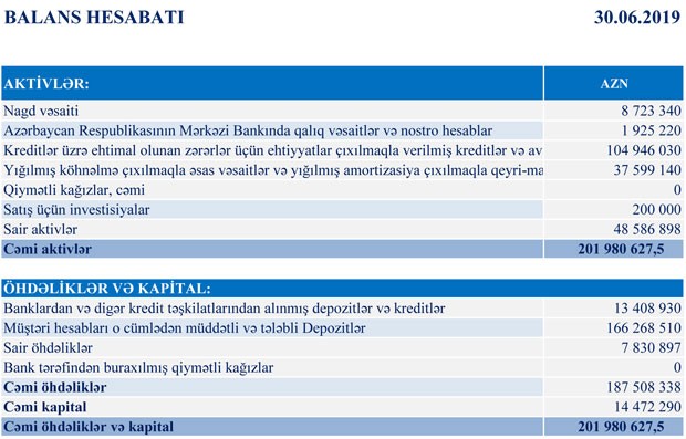 Bankın depozit portfelində də atrım var. Belə ki, 30 iyun 2018-ci il tarixinə depozit portfeli 148 mln. 429 min AZN, o cümlədən əhalinin əmanətləri 123 mln. 542 min AZN təşkil edirdi. Cari ilin birinci yarımiliyinin sonuna depozit portfeli 17 mln. 839 min artaraq, 166 mln. 268 min AZN təşkil etmişdir. Əhalinin əmanətləridə 23 mln. 178 min AZN artaraq 146 mln. 720 min AZN təşkil etmişdir.