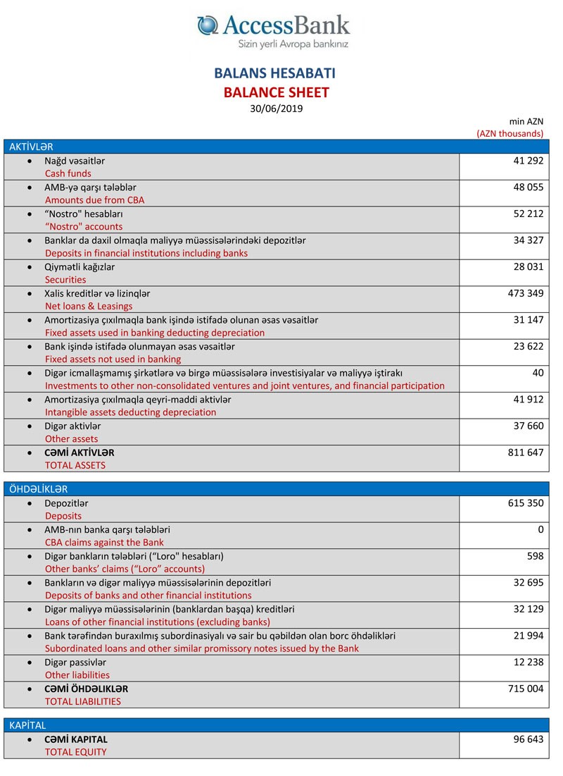 100% xarici kapitallı bank “AcessBank” QSC 2019-cu ilin 1-ci yarısına dair maliyyə göstəricilərini açıqlayıb.