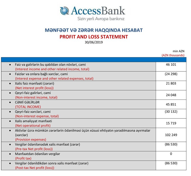 Müqayisə üçün qeyd edək ki, 2018-ci ilin 1-ci yarısında “AccessBank”ın 43 milyon 390 min manat cəmi gəlirinə qarşı cəmi xərcləri 61 milyon 258 min manat təşkil etmişdi və nəticədə 17 milyon 868 milyon xalis əməliyyat zərəri yaranımışdı. 2018-ci ilin yekununda isə “AccessBank”ın 32 milyon 994 min manat xalis əməliyyat zərəri yaranmışdı.