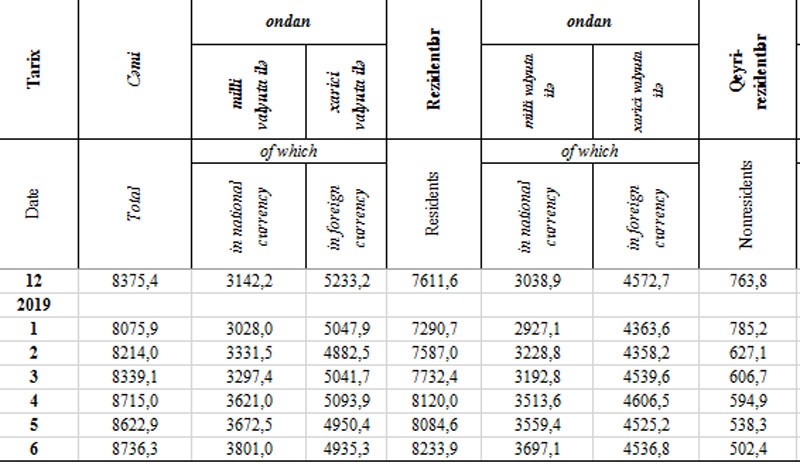 Mayın sonunda 3 milyard 146.8 milyard manat təşkil etmiş tələbli əmanətlər İyunun sonunda 3 milyard 296.4 milyon manata çatıb. İlk 6 ayda isə tələbli əmanətlər 505,7 milyon manat artıb. 30 İyun 2019-cu il tarixində fiziki şəxslərin (əhalinin) müddətli əmanətləri isə 5 milyard 337.4 milyon manat təşkil edib. Bu, cari ilin mart ayının sonu ilə müqayisədə 128,4 milyon manat, ötən ilin sonu ilə müqayisədə isə 141,6 milyon manat azdır.