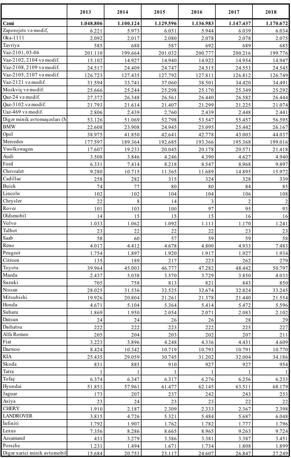 Həmçinin Azərbaycanda 199 min 16 ədəd Mercedes-Benz, 68 min 179 ədəd Hyundai, 50 min 797 ədəd Toyota, 47 min 518 ədəd QAZ, 44 min 37 ədəd Opel, 34 min 186 ədəd KİA, 33 min 245 ədəd Nissan, 26 min 167 ədəd BMW, 21 min 554 ədəd Mitsubishi, 21 min 418 ədəd Wolkswagen və s. qeydiyyatda olub.