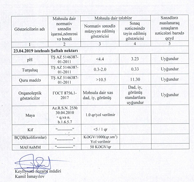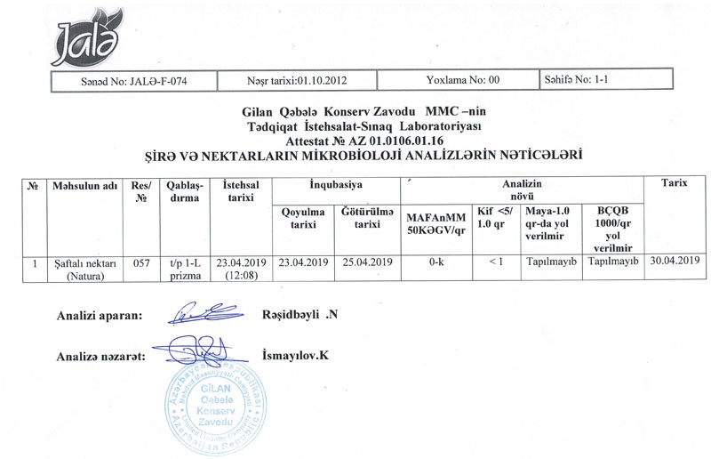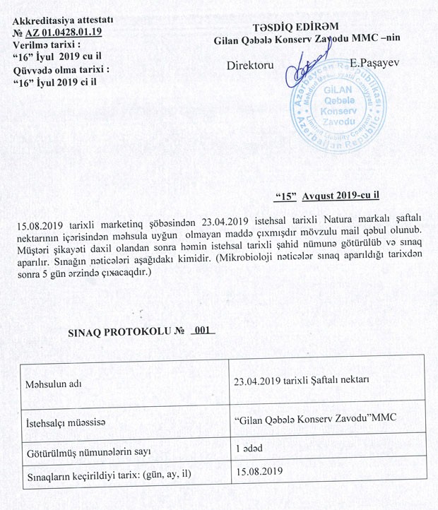“Natura” markalı şaftalı nektarının Sınaq Protokolunun və Mikrobioloji analizin surətləri