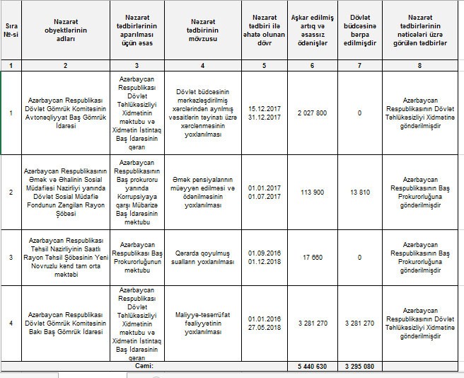 2019-cu ilin birinci yarısında aparılan nəzarət tədbirləri zamanı bir sıra xarakterik nöqsanlar da aşkarlanıb. Belə ki, bəzi hallarda yolların, mənzil fondunun və büdcə təşkilatlarının yerləşdikləri binaların əsaslı və cari təmiri üçün ayrılmış vəsaitlərin təyinatına xərclənməsi üzrə aparılan nəzarət tədbirləri ilə yerinə yetirilmiş kimi sənədləşdirilən işlərin həcminin əsassız olaraq artırıldığı, malların (iş və xidmətlərin) satın alınması zamanı qanunvericiliyin tələblərinə zidd olaraq bəzi hallarda satınalma müsabiqələrinin keçirilmədiyi aşkar edilib.