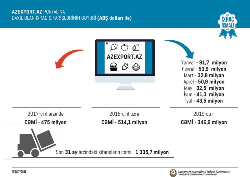 Göstərilib ki, 2019-cu ilin yanvar-iyul aylarında Azexport.az portalına 346,6 milyon ABŞ dolları dəyərində ixrac sifarişləri daxil olub. 2018-ci ilin müvafiq dövrü ilə müqayisədə cari ilin yanvar-iyul aylarında ixrac sifarişləri 10 faiz artıb.