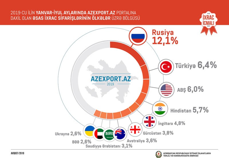 2019-cu ilin iyul ayında isə portala daxil olan ixrac sifarişlərinin dəyəri 43,5 milyon ABŞ dolları təşkil edib və ötən ilin iyul ayı ilə müqayisədə 40 faizlik artım qeydə alınıb. 2019-cu ilin yanvar-iyul aylarında portala daxil olan ixrac sifarişlərinin ilk beşliyində Rusiya(12,1%), Türkiyə (6,4%), ABŞ (6%), Hindistan (5,7%) və İngiltərə (4,8%) qərarlaşıb.