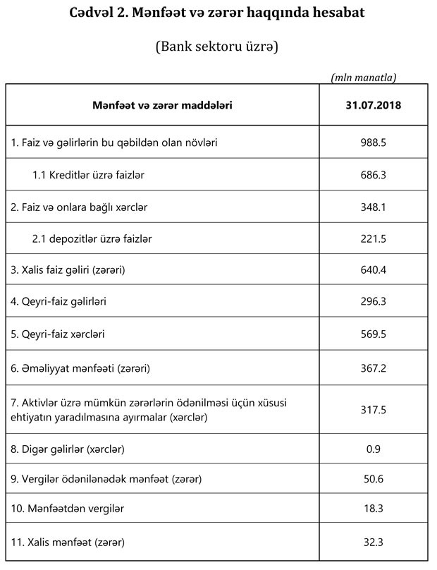 Maliyyə Bazarlarına Nəzarət Palatasının açıqladığı məlumata görə, 2019-cu ilin 7 ayı ərzində bankların əməliyyat mənfəəti 472.4 milyon manat, xalis mənfəəti isə 406.2 milyon manat təşkil edib.
