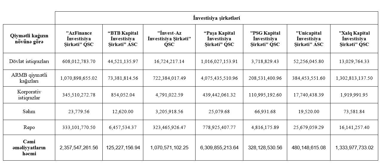 Birjadan "Marja"ya daxil olmuş məlumata görə, “PAŞA Kapital İnvestisiya Şirkəti” QSC 6 milyard 309 milyon 855 min manat dövriyyə ilə 1-ci, "AzFinance İnvestisiya Şirkəti" QSC 2 milyard 357 milyon 547 min manat dövriyyə ilə 2-ci, "Xalq Kapital İnvestisiya Şirkəti" QSC 1 milyard 333 milyon 977 min manat dövriyyə ilə 3-cü, "İnvest-Az İnvestisiya Şirkəti" QSC 1 milyard 70 milyon 571 min manat dövriyyə ilə 4-cü, "Unicapital İnvestisiya Şirkəti" ASC 480 milyon 148 min manat dövriyyə ilə 5-ci, "PSG Kapital İnvestisiya Şirkəti" QSC 328 milyon 129 min manat dövriyyə ilə 6-cı, “BTB Kapital İnvestisiya Şirkəti” ASC 125 milyon 227 min manat dövriyyə ilə 4-cü yerdə olub.