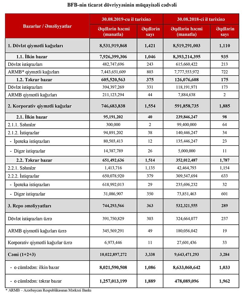 Qeyd edək ki, cari ilin 8 ayı ərzində dövlət qiymətli kağızlar bazarının həcmi 8 milyard 532 milyon manat təşkil edib. Bu, ötən ilin eyni dövrü ilə müqayisədə cüzi çoxdur. Bazarda ticarət həcminin 7 milyard 444 milyon manatı Mərkəzi Bankın notlarının ilkin bazarda yerləşdirilməsinin payına düşüb.