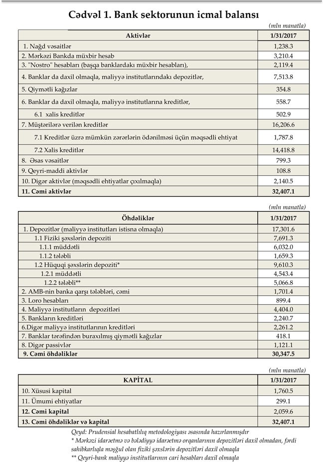 Azərbaycanda fəaliyyət göstərən 32 bankın 31 yanvar 2017-ci il tarixinə cəmi aktivləri 32,407.1 milyon manat, cəmi öhdəlikləri 30,347.5 milyon manat təşkil etmişdir. Sektorun balans kapitalı 2,059.6 milyon manatdır. Əhalinin əmanətləri 7,691.3 milyon manat həcmindədir. Bu barədə "Marja"ya Maliyyə bazarlarına Nəzarət Palatasından bildirilib.