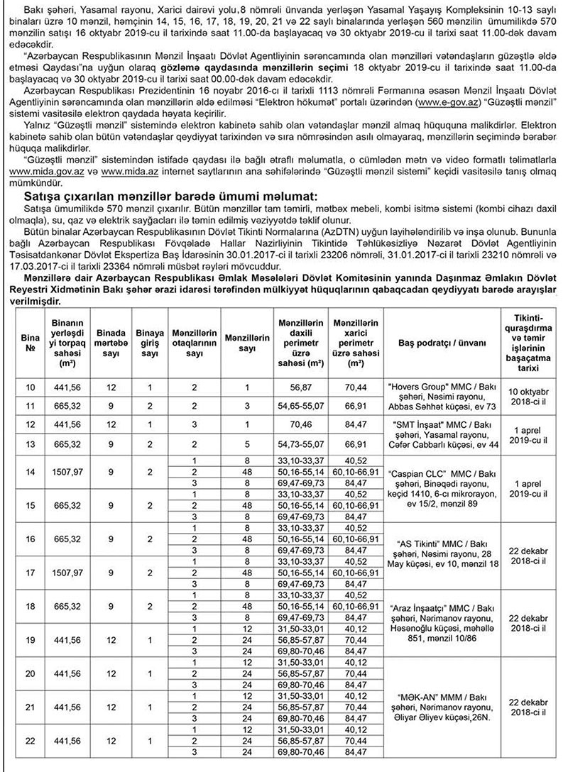 Azərbaycan Respublikası Mənzil İnşaatı Dövlət Agentliyinin ilk layihəsi - Yasamal Yaşayış Kompleksində mənzillərin güzəştlə satışı barədə ELAN