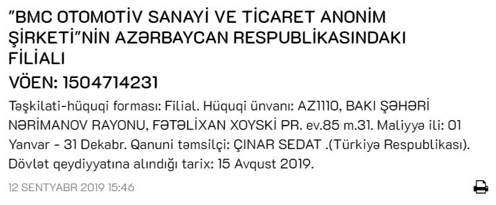 Avqustun 15-də Vergilər Nazirliyi Türkiyənin "BMC Otomotiv Sanayi ve Ticaret Anonim Şirketi"nin Azərbaycandakı filialını dövlət qeydiyyatına alıb.