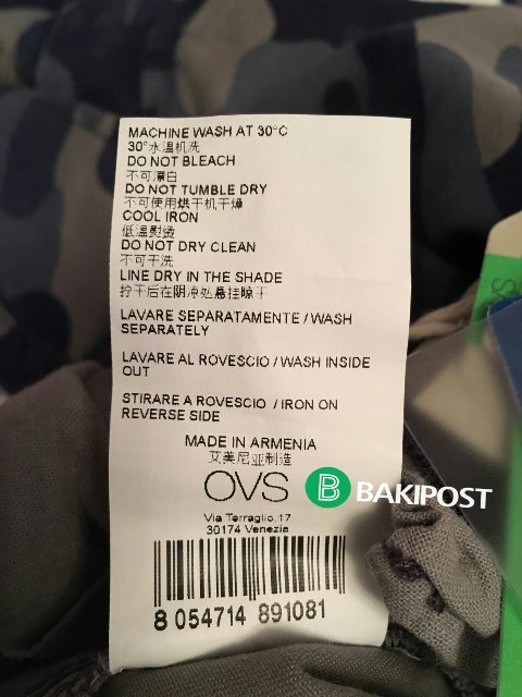 "Park Bulvar” və "Gənclik Mall”da fəaliyyət göstərən "OVS” mağazalarında müştərilərə üzərindəki etiketdə "MADE İN ARMENİA” yazılan paltarlar təqdim edilir.