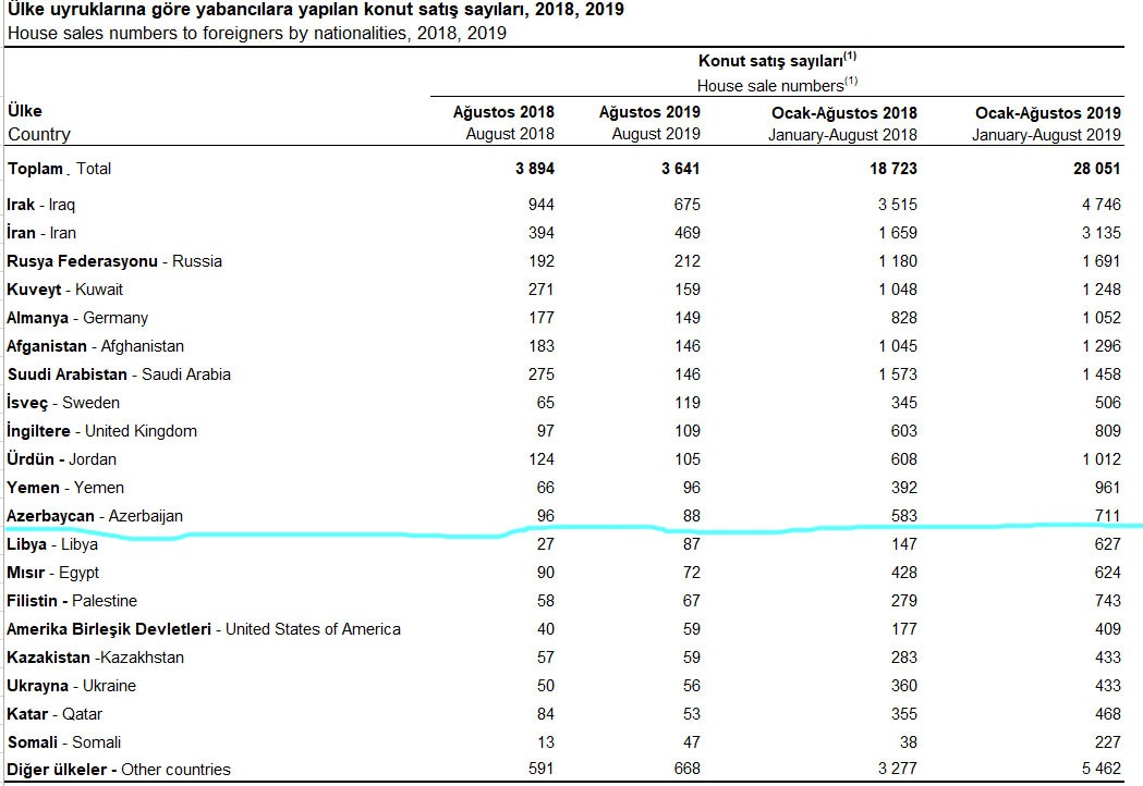 2019-cu ilin Yanvar-Avqust dövründə (8 ayda) isə azərbaycanlılar Türkiyədə 711 mənzil alıblar (orta hesabla hər gün 3 mənzil). 2018-ci ilin eyni dövründə bu say 583 idi.