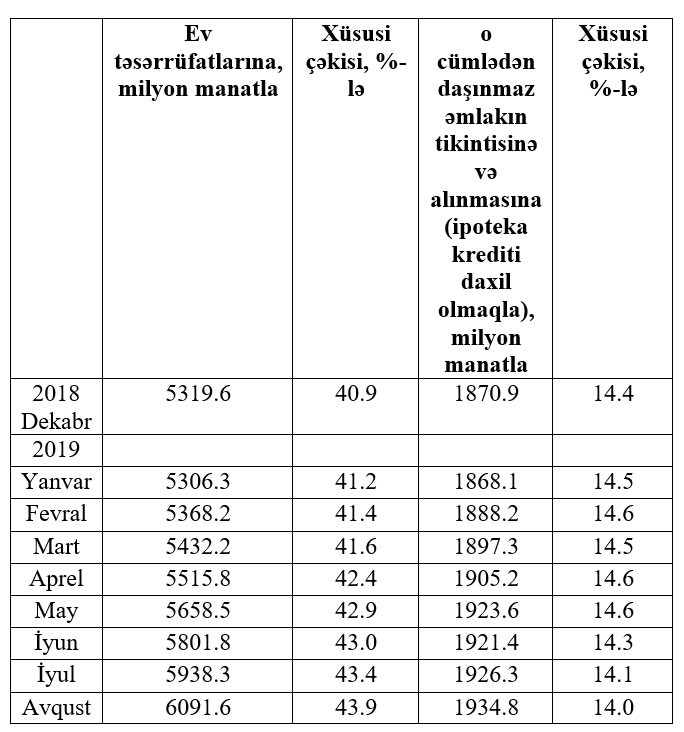 Avqust ayında cəmi kredit qoyuluşlarının 44%-i ev təsərrüfatlarına verilən kreditlərdən ibarət olub. 2018-ci ilin sonunda bu nisbət 41% idi.
